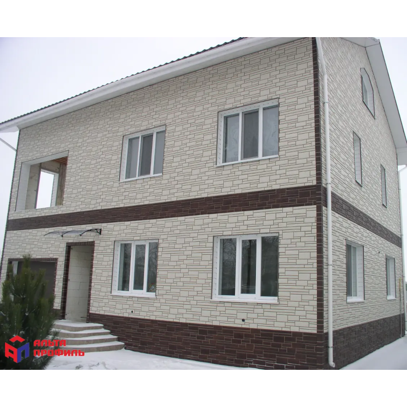 Фасадная панель под камень с комбинацией из набора пластин разной величины коллекции Камень от Альта-Профиль. Панель изготовлена из полипропилена методом литья под давлением, имеет небольшой вес, поэтому не создает дополнительной нагрузки на несущие конструкции. Материал устойчив к грибку, плесени и коррозии. За счет ребер жесткости и увеличенной толщины (23 мм), панели устойчивы к механическим и температурным воздействиям, не деформируются. Многослойное окрашивание надежно защищает от УФ-лучей, обеспечивая сохранность цвета долгие годы.