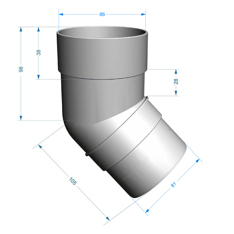 Колено трубы 45° D85 мм цвета Шоколад серии PREMIUM от производителя Docke. Элемент водосточной системы, соединяет воронку с водосточной трубой и применяется для огибания карнизного вылета крыши, а также позволяет соединять трубы под углом, если нужно обойти архитектурный элемент на фасаде.