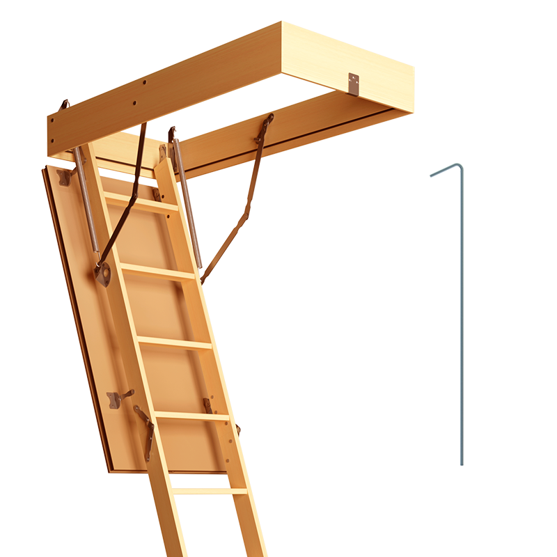 Чердачная лестница Docke STANDARD устанавливается в потолочный проем 60x120 см и подходит для помещений с высотой потолков 2,8 метра. В комплект поставки входит металлическая фурнитура, запорный замок, ручка - ключ. При необходимости дополнительно можно приобрести поручни и наконечники на ножки.