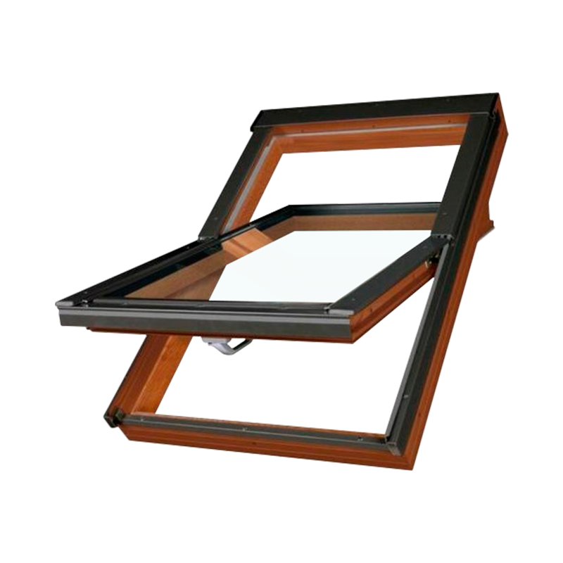 Мансардное окно FAKRO PТР U3 со среднеповоротным открыванием, оснащено фрикционными петлями, располагающимися в его центральной части. Такая конструкция позволяет оставлять створку окна в позиции наклона, а также поворачивать её вокруг своей оси на 180°, что значительно облегчает мытье внешнего стекла.