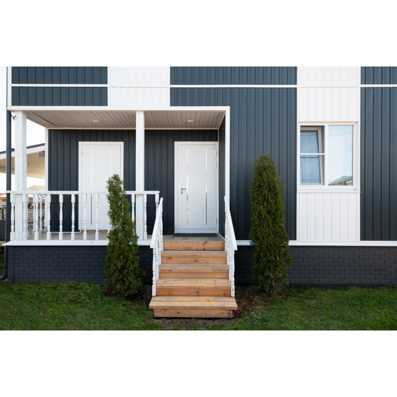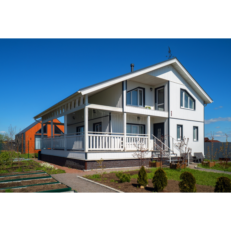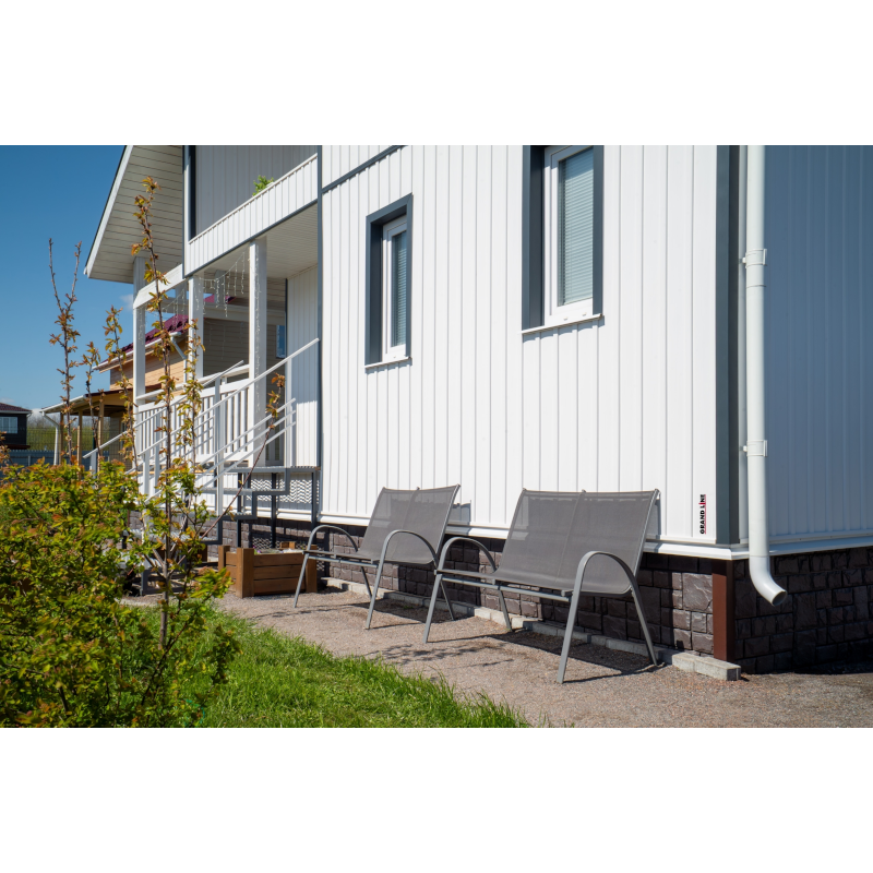 Панель вертикального сайдинга может использоваться как самостоятельно, так и в сочетании с горизонтальным сайдингом, что позволяет сделать акцент на отдельных элементах фасада – фронтоны, мансарды, цоколь. Также популярна в использовании для подшивки карнизных и фронтонных свесов. Идеальна для облицовки домов, рассчитанных на несколько семей – дуплексов, лэйнхаусов и квадрохаусов.