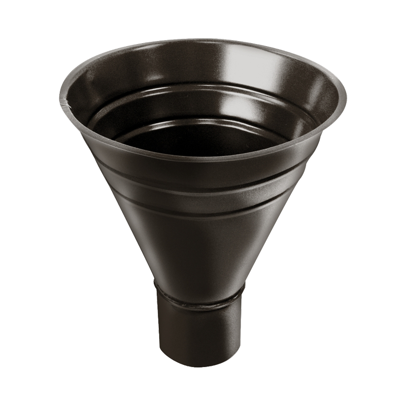 Воронка водосборная D125/90 мм коричневая RR32 с покрытием Granite Double от Гранд Лайн. Элемент водосточной системы, применяется для сбора воды со сложных форм крыш, фальцевых кровель, в тех случаях, когда сток не организован посредством желоба.